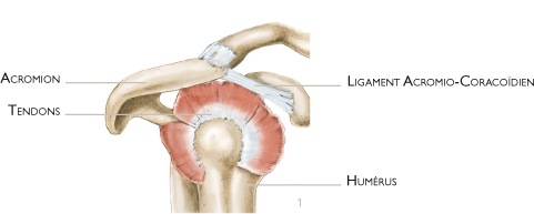 L’épaule correspond à l’articulation entre l’omoplate et l’humérus. La partie supérieure de l’humérus constitue une tête qui pivote dans un creux de l’omoplate qui est la glène. L’acromion est une partie de l’omoplate qui forme avec le Ligament Acromio-Coracoïdien une voûte au dessus de l’articulation. Les tendons de la coiffe relient les muscles à l’os. Ils s’insèrent autour de la tête de l’humérus et coulissent entre la tête et l’acromion lors des mouvements de l’épaule (figure 1).