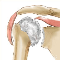L’arthrose excentrée est l’usure du cartilage associée à une ascension de la tête humérale due à la rupture des tendons de la coiffe. Cette usure s’accompagne aussi de remaniements de l’os de l’humérus et de l’omoplate (figures 2 et 5). Ces modifications occasionnent une douleur et une diminution de la mobilité ainsi qu’une difficulté à utiliser le bras nécessitant l’utilisation importante d’anti-inflammatoires et d’anti-douleurs.