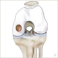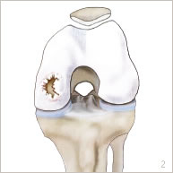 Une lésion cartilagineuse peut survenir lors d’un choc, à la suite de petits traumatismes répétitifs, ou à la suite d’une imperfection de la croissance. Le cartilage ainsi abîmé se décolle seul de son emplacement naturel ou accompagné d’une petite partie osseuse sous-jacente (figures 2 et 5). Il peut se détacher partiellement sous forme d’un clapet, ou bien complètement constituant ainsi un fragment libre. La zone de défect cartilagineux peut être plus ou moins étendue et plus ou moins profonde. La lésion cartilagineuse peut occasionner des douleurs, des blocages, des gonflements voire des sensations d’instabilité. Des lésions ligamentaires ou méniscales peuvent être associées.