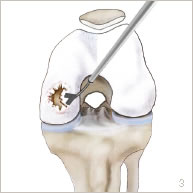 L’intervention consiste à extraire une lésion superficielle partiellement ou complètement détachée. Elle traite par ailleurs la zone du défect en stimulant la réparation cartilagineuse.