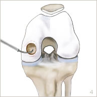 Elle est réalisée sous arthroscopie, c’est à dire sans ouvrir l’articulation. Deux petites incisions de 5 mm chacune sont réalisées en avant du genou. Une petite caméra est introduite par l’une d’entre elles pour visualiser l’articulation. Des petits instruments sont introduits par l’autre incision pour réaliser le geste chirurgical.