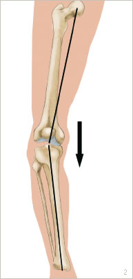 L’arthrose débutante interne est l’usure du cartilage présent entre la partie interne du fémur et du tibia. La morphologie du membre inférieur en est souvent la cause principale. Sur une forme incurvée, tout le poids du corps passe plutôt par la partie interne du genou (figure 2). Cette surcharge aboutit à l’usure prématurée du cartilage et du ménisque occasionnant douleur, enraidissement et difficulté à la marche.