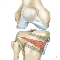 Les anti-inflammatoires et les anti-douleurs qui peuvent suffire au départ finissent par ne plus être efficaces. C’est à ce moment que se pose la question d’une intervention chirurgicale. Le but de l’opération est de soulager la partie interne du genou des pressions excessives et de casser le cercle vicieux de l’usure chez le sujet jeune. Ceci permettra le soulagement de la douleur et le ralentissement de l’évolution arthrosique.