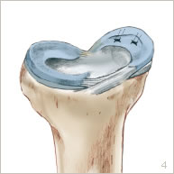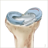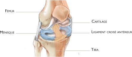 Le genou correspond à l’articulation entre la partie basse du fémur et la partie haute du tibia. Les surfaces de glissement sont recouvertes de cartilage. Les ménisques sont des petits coussinets en forme de croissant situés entre le cartilage du fémur et celui du tibia. Il existe deux ménisques dans chaque genou : un ménisque interne et un ménisque externe (figures 1 et 5). Il améliorent le contact et jouent un rôle d’amortisseurs entre le fémur et le tibia. Avec le temps, les ménisques ont tendance à perdre leur hydratation et le cartilage a tendance à s’amincir.