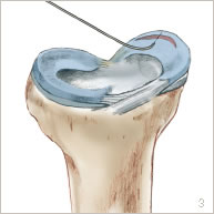 Elle est réalisée sous arthroscopie, c’est à dire sans ouvrir l’articulation. Deux petites incisions de 5 mm chacune sont réalisées en avant du genou. Une petite caméra est introduite par l’une d’entre elles pour visualiser l’articulation. Des petits instruments sont introduits par l’autre incision pour réaliser le geste chirurgical.