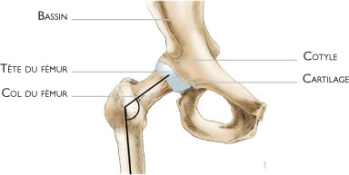 La hanche correspond à l’articulation entre le bassin et le fémur. La partie supérieure du fémur est formée d’un col et d’une tête qui pivote dans une cavité du bassin appelée cotyle (figure 1). Les surfaces articulaires de glissement sont recouvertes de cartilage. De nombreux muscles et tendons entourent cette articulation et assurent la mobilité de l’articulation et l’équilibre de la marche.