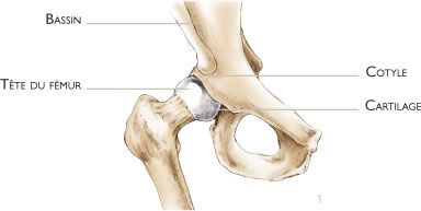 La hanche correspond à l’articulation entre le bassin et le fémur. La partie supérieure du fémur constitue une tête qui pivote dans une cavité du bassin appelée cotyle. Les surfaces articulaires de glissement sont recouvertes de cartilage (figure 1). De nombreux muscles et tendons entourent cette articulation et assurent la mobilité de l’articulation et l’équilibre de la marche.