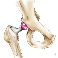 La prothèse comporte deux parties : la cupule qui est une partie hémisphérique creuse implantée au niveau du bassin, et la tige avec une bille qui est implantée au niveau du fémur. La bille remplace la tête du fémur et s’articule avec la cupule (figures 6 et 7).
